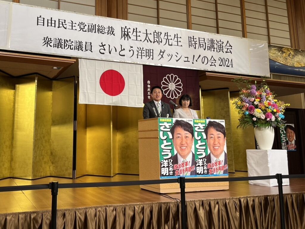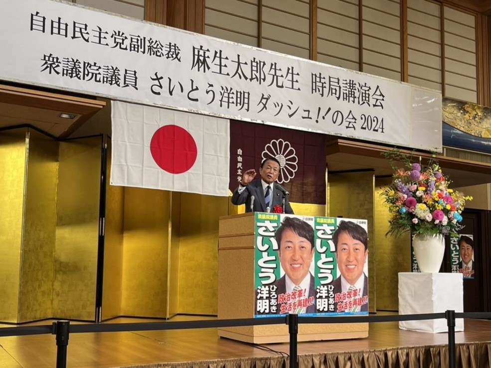 HOME > お知らせ > お知らせ 麻生太郎先生時局講演会ならびにさいとう洋明衆議院議員ダッシュの会に参加いたしました 2024年6月17日 6/16(日) 麻生太郎先生時局講演会ならびにさいとう洋明衆議院議員ダッシュの会にお招きいただきました。 -お知らせ