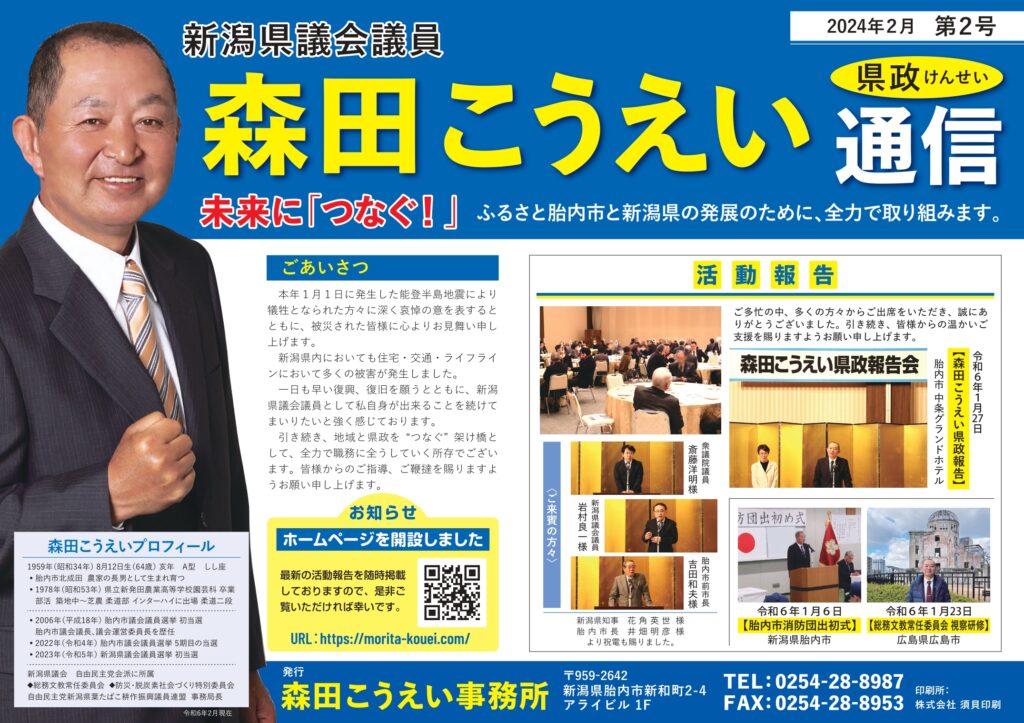 HOME > お知らせ > お知らせ 県政通信 森田こうえい県政通信 第2号を発行いたしました 2024年2月29日 この度、森田こうえい県政通信 第2号を発行いたしました。 是非ご一読いただけますと幸いです。 ※画像をクリックするとPDFが出ます -お知らせ, 県政通信