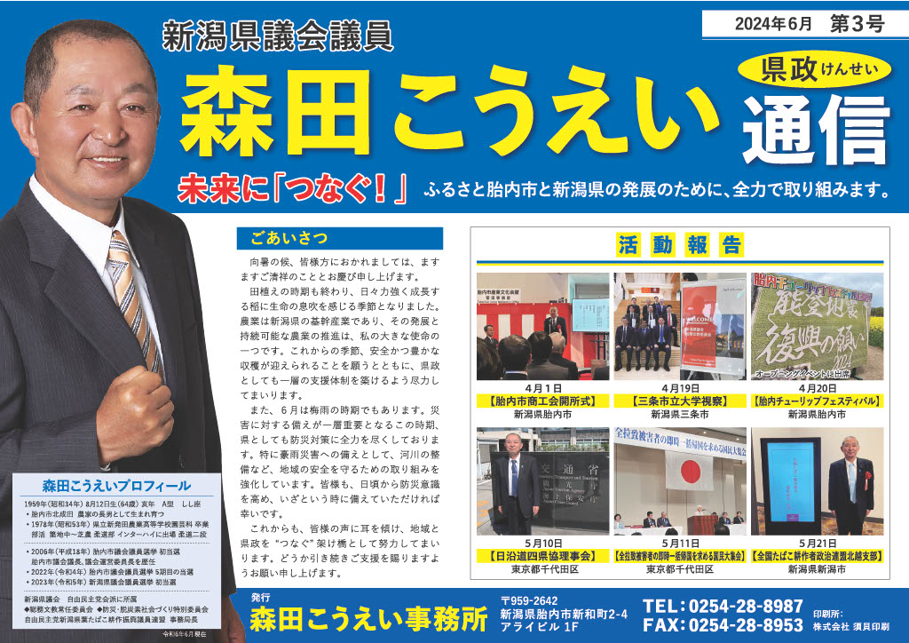 HOME > お知らせ > お知らせ 森田こうえい県政通信 第3号を発行いたしました 2024年6月12日 この度、森田こうえい県政通信 第3号を発行いたしました。 是非ご一読いただけますと幸いです。 ※画像をクリックするとPDFが表示されます -お知らせ