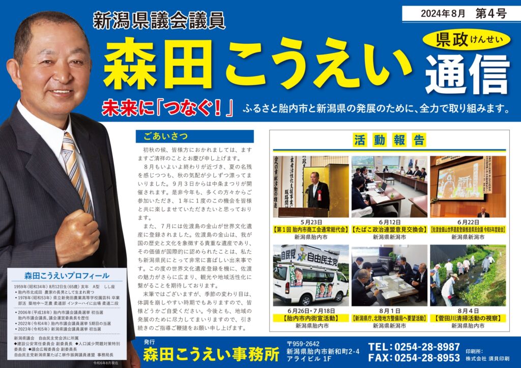HOME > お知らせ > お知らせ 県政通信 森田こうえい県政通信 第4号を発行いたしました 2024年8月31日 この度、森田こうえい県政通信 第4号を発行いたしました。 是非ご一読いただけますと幸いです。 ※画像をクリックするとPDFが表示されます -お知らせ, 県政通信