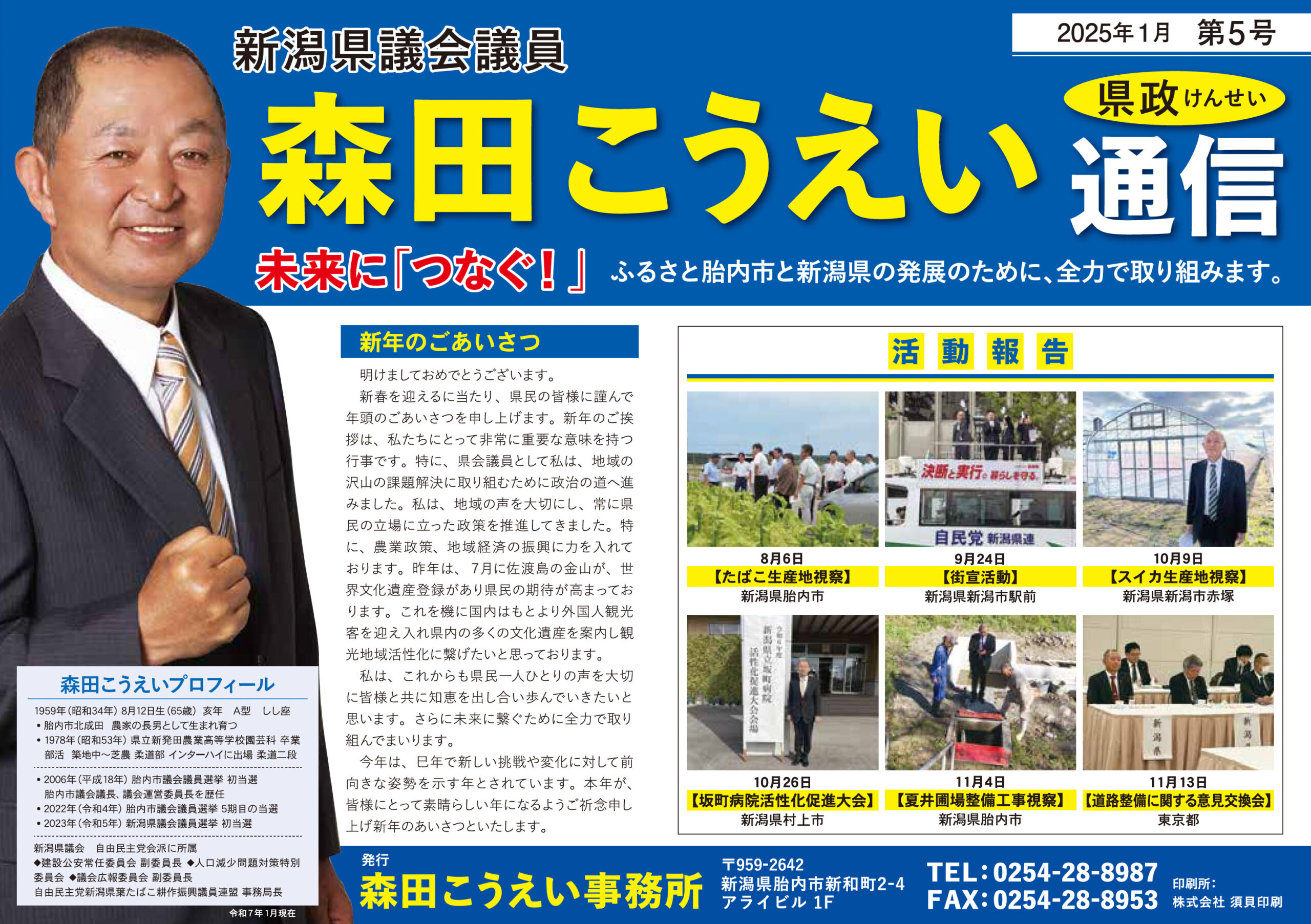 HOME > お知らせ > お知らせ 県政通信 森田こうえい県政通信 第5号を発行いたしました 2025年1月5日 この度、森田こうえい県政通信 第5号を発行いたしました。 是非ご一読いただけますと幸いです。 ※画像をクリックするとPDFが出ます -お知らせ, 県政通信